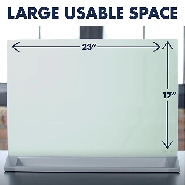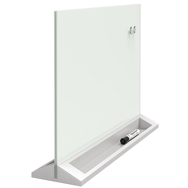 Quartet® Magnetic Desktop Glass Dry-Erase Panel is made from tempered glass and is stain and ghost resistant for superior erasability. White glass dry-erase surface is double-sided and magnetic. Panel is self-standing, frameless and 17″ x 23″ for desktop use. Limited 15 year warranty.