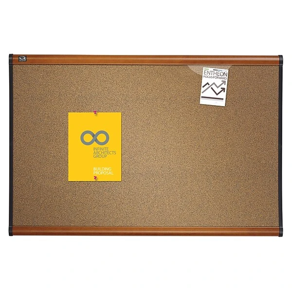 Use the patented, easy-mount system of this bulletin board to quickly display important photos, displays, and reminders. With an aluminum frame and cherry finish, this bulletin board is lightweight enough to hang in a variety of spaces. This Quartet bulletin display board has a self-healing cork surface that looks smooth and seamless after use.