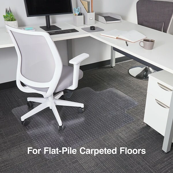 Built to fit in almost any desk workspace, the Quill Brand Flat Pile Carpet Chair Mat with Lip is easy to maneuver and install on commercial-style low-pile carpets that are up to 1/8-inch thick. The chair mat’s smooth surface and straight edge make it easy to move your chair, while the mat’s transparent design fits any decor.