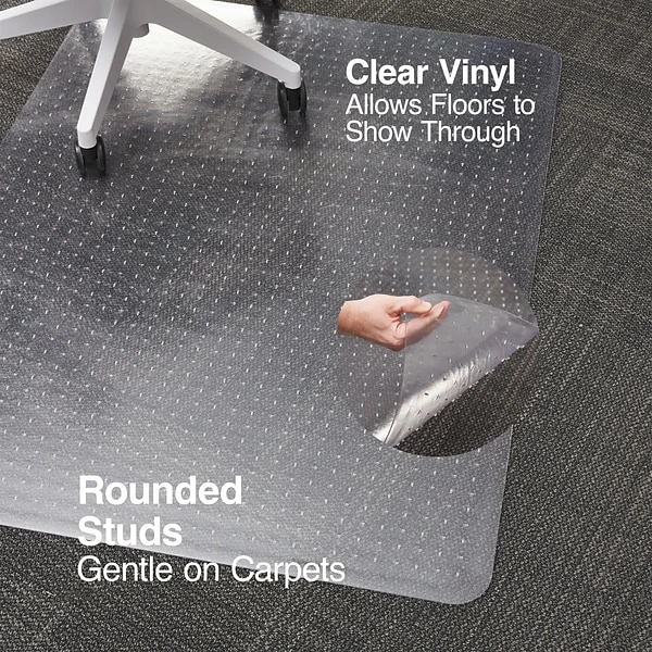 Extend the life of your high pile carpet (up to 1″ thick including padding depth) by protecting against chair caster wear and tear. The perfect addition to your workspace, this chair mat provides a smooth surface that enhances ergonomic comfort by allowing your rolling office chair to move freely. Easy to handle, this chair mat features rounded AnchorBar cleats (studs) that hold your mat in place and are gentle on carpets and fingers (no sharp spikes). This chair mat is made with durable vinyl that is GREENGUARD Gold Certified for low chemical emissions to promote a healthier workspace. Designed for use on carpeted surfaces only, do not use on hard floors.