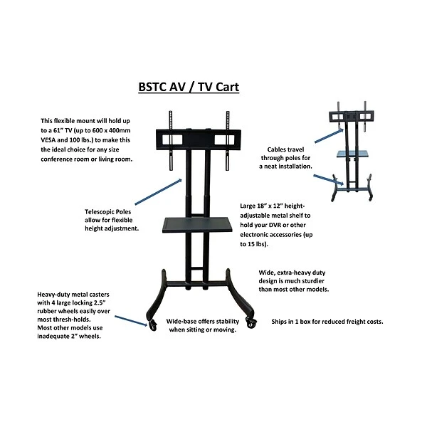 The perfect rolling TV cart that allows you to move your TV into other areas such as offices, conference rooms, classrooms, training centers, etc. This heavy-duty steel VSTC rolling cart has a flexible mount that holds up to a 70-inch TV. With telescopic poles, you’re able to have flexible height adjustments for TV viewing. Other features include heavy-duty metal casters on the bottom with 2.5″ locking wheels. There is a large 18″ by 12″ adjustable metal shelf to hold your DVR or other electronic accessories.
