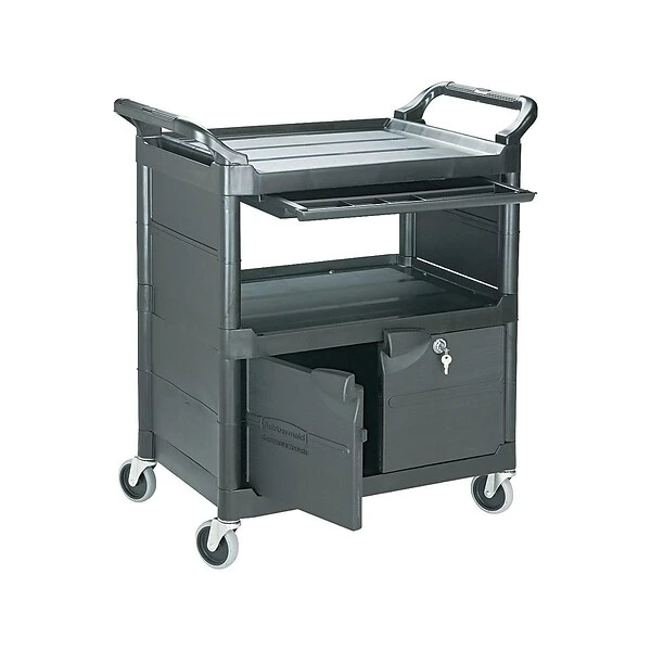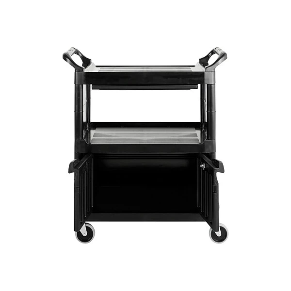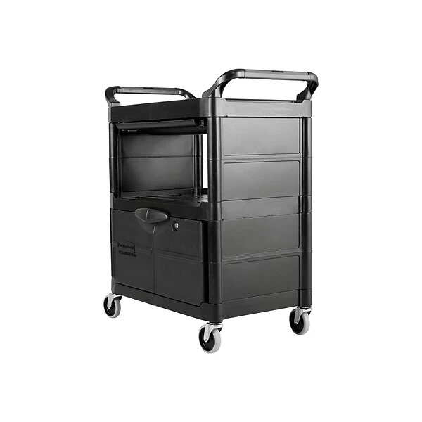 Keep supplies and tools securely stored and easily transportable with this Rubbermaid two-shelf utility cart. Featuring locking doors, this cart ensures the safety of stored items, while the swivel wheels allow for easy transportation. Made of durable plastic and poly materials, this cart is heavy duty and designed to move up to 200 pounds of materials. Dual ergonomic hand grips on each end provide an easy way to move this Rubbermaid black commercial utility cart.