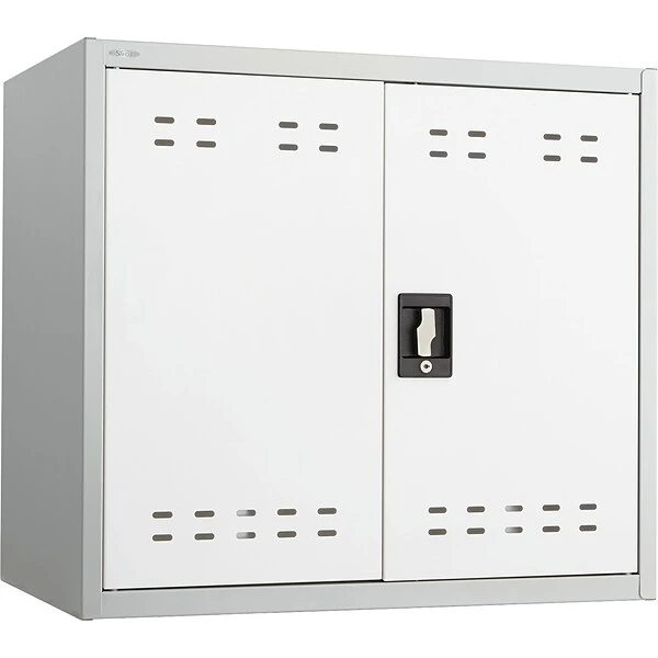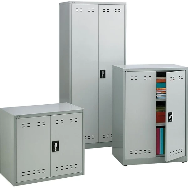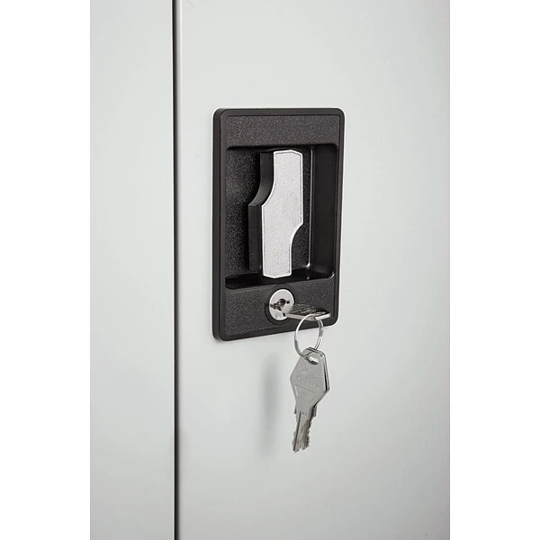Place this steel storage cabinet in an office, entryway or warehouse for storing your office supplies, personal belongings or power tools. The recessed lock keeps everything secure without the risk of catching on clothing in a busy work space. Leveling glides provide a secure base on uneven surfaces and make it easier to move the unit for cleaning and repositioning. The two-tone finish looks great in an office waiting room while the heavy-duty steel construction is tough enough to handle a warehouse o r garage environment.