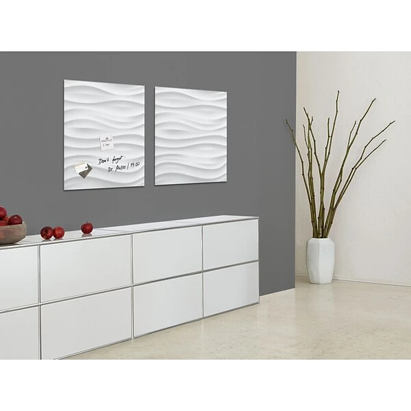 Mount this frameless magnetic glass board to your wall, and enjoy a convenient place to write notes and post documents. A contemporary wave pattern on this square board brings movement and sleek styling to the room. Constructed of tempered safety glass and safety-approved mounting hardware, this board is safe for use by children in homes and classrooms. Two powerful SuperDym magnets keep your papers securely attached to the board, and when used with Sigel chalk markers, this glass board easily wipes clean with an eraser or cloth.