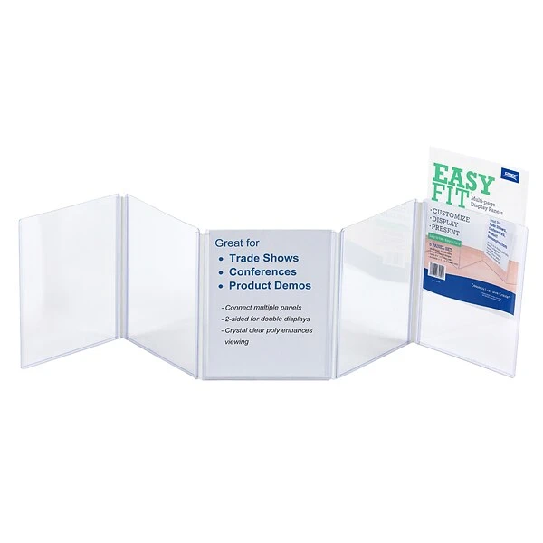 EasyFit Display Panel, double-sided clear document display holder, customizable to needed length. Portable, durable and great for displaying pertinent information in an upright manner at shows, offices and homes. Folds easily for storing and travel.