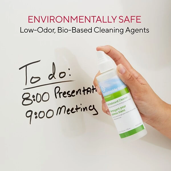 Make whiteboards shine by removing stains, smudges and ghost marks with this 8-ounce bottle of multi whiteboard cleaner. This solution contains bio-based cleaning agents that effectively clean while remaining environmentally safe, making this bottle a good choice for green-minded businesses. This Sustainable Earth by Staples bottle of multi whiteboard cleaner has a low-odor formulation for minimum disruption, and the spray bottle makes it simple to apply.