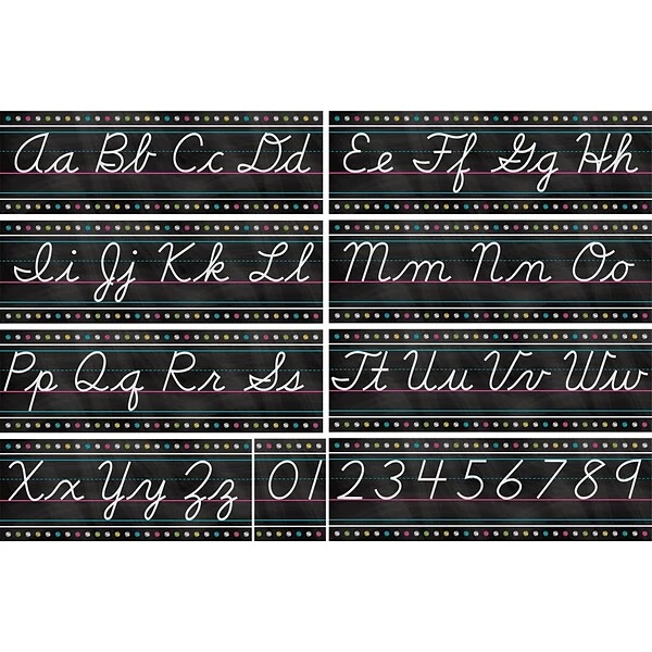 Display the alphabet and numbers 0-9 as a handy reference for young students. The 4-page teacher’s guide includes writing tips. Includes 9 panels for over a 17-foot long alphabet line. Each 4-letter panel is 23-1/2″ x 7-1/2″.