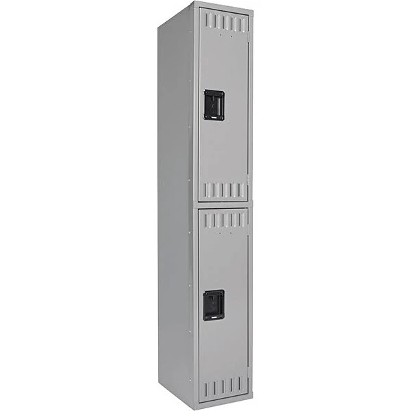 Tennsco™ Double-tier locker with a gray finish features vertical louvers on the top as well as the bottom of each door for ventilation. Locker contains 2 lockers and has vandal proof recessed handles and a padlock hasp on each door.