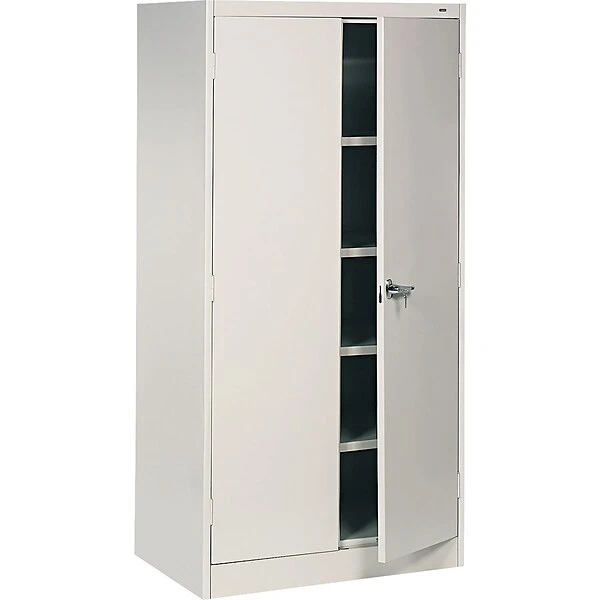 Tennsco Standard storage cabinet in light gray color has 4 shelves that can be adjusted to hold different items. Cabinet includes single handle lock that allows to lock behind left door.