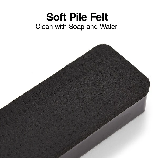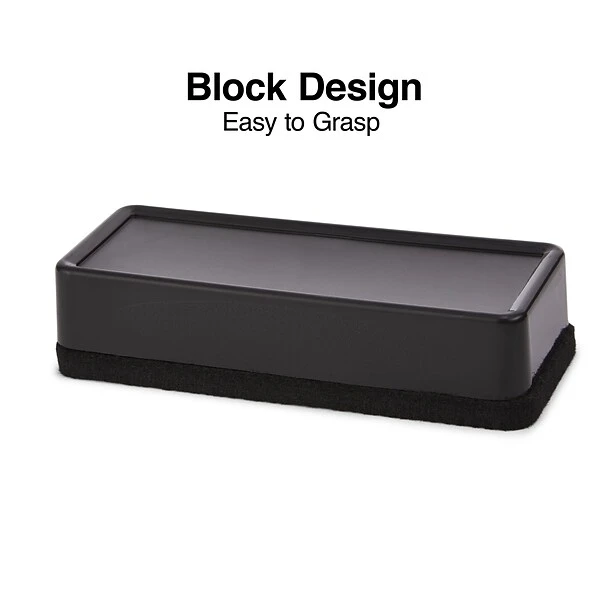 Clean whiteboards and other dry-erase surfaces with this eraser. Quick and convenient, this eraser is ideal for keeping on hand in meeting rooms, in classrooms or next to any surface where dry-erase markers are routinely used. The black color looks sleek in any space, and the lightweight construction is simple to handle. At just under 2 inches wide, this eraser sits easily on most whiteboard marker trays or can be slipped into other small storage areas. This Staples eraser wipes away dry-erase residue quickly and easily for clean surfaces and prevents damage to whiteboards from dried ink.
