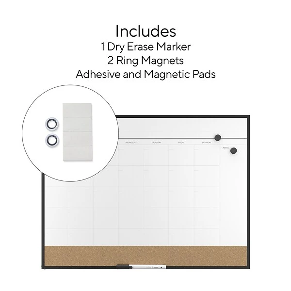 Stay on top of classes, meetings and other appointments with this dry-erase whiteboard and natural cork surface. This calendar board holds sticky notes, pictures and other important papers, while the compact construction helps it comfortably fit into any office, home or work-station. This TRU RED one-month-design black-frame whiteboard comes with self-stick tape, letting you mount it onto the wall quickly.