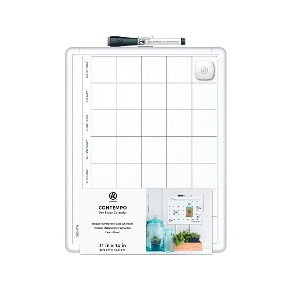 For a calendar, you can use month after month and year after year, look no further than this white U Brands Contempo monthly calendar dry-erase board. Simply mark in the correct dates and months to start planning project deadlines, appointments, or reminders; then erase it all when the month is through for a calendar that you can use over and over. This size is perfect for personal workspaces, classrooms, dorm rooms, or your home. Includes one black bullet-tip marker with built-in eraser cap, one marker clip, and a round magnet to get you started.