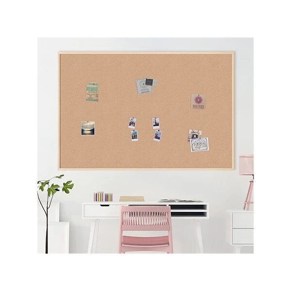This bulletin board features a self-healing natural cork surface that resists push pin holes after each use.