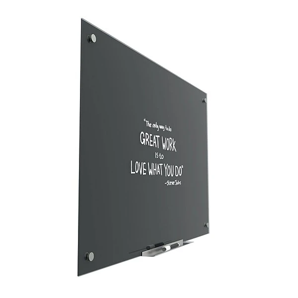 This black glass dry-erase-board is a perfect and functional solution for the frequent and heavy usage areas of your office, school classroom, home or any commercial space. Clean, contemporary and frameless product design lines will add a touch of subtle style to your wall. The modern frameless feature enables you to hang multiple glass boards adjacent to each other and expand the writing surface to fit your custom space needs. The board’s premium ultimate glass writing surface will never stain or ghost. All ink erases easily with a simple eraser and the glass surface continuously outperforms all traditional melamine or painted steel dry-erase writing surfaces. Occasionally, use any dry erase board spray or wet dry erase board wipes after continuous use to clean the writing surface. Although all dry-erase and glass markers work well with this board, the U Brands dry erase markers provide the ultimate writing and eras-ability experience. For safety, the board is made from tempered glass as well. This whiteboard board has a universal mounting system, as it can be hung vertically or horizontally to fit your allocated space. All wall hanging hardware is hidden under the mounting bolts for a sleek and modern appearance. Mounting hardware and instructions are included for quick and easy mounting. The board is packaged with extra supportive corrugate material that is highly resistant to damage during shipping; all corrugated material can be recycled once unpacked.