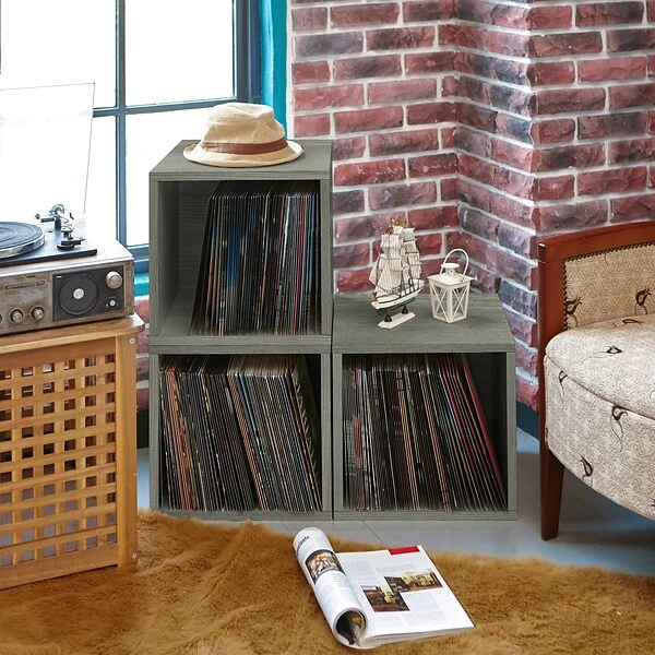 The Way Basics Stackable Large Storage Cube is large enough to hold up to 70 records. But if records aren’t your thing, this extra large cube can handle anything you throw at it. From toys, office supplies, to larger books that don’t fit in traditional bookshelves, this large Cube can take it on. It can be used on its own or with other cubes for maximum storage potential. It is eco friendly, made from zBoard recycled paperboard that is free from formaldehyde and VOC. Super easy to assemble too; no tools needed, just peel, stick, done!