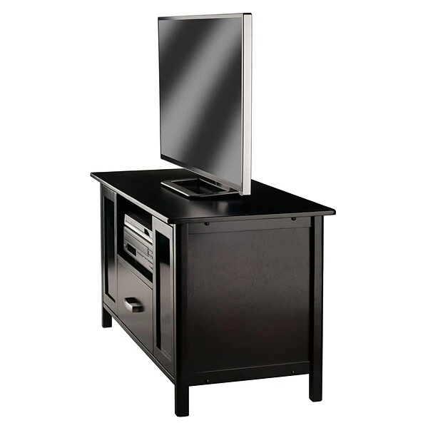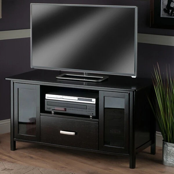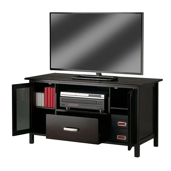 Merging polished craftsmanship and function, the Bradford Media Console/TV Stand will enhance any room in your home. It features tinted, tempered glass doors on either side that open to cabinets with adjustable shelves to keep video games and movies organized and free of dust. The center open shelf is ideal for a cable box, DVD player or Roku. Use the ample storage drawer for audiovisual components and more. Made of solid and composite wood in a rich Espresso finish. Model# 92544