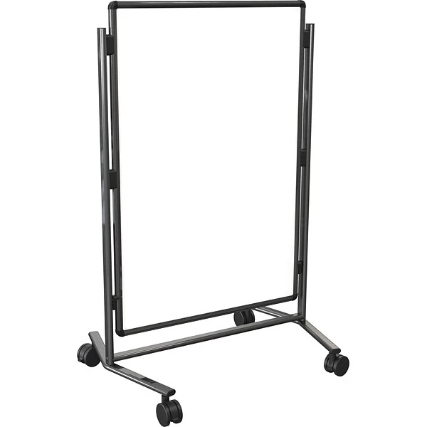 Versatility The versatile Modifier XV height-adjustable easel is adjustable to different heights, so whether you’re lowering the easel to work with children or need to make the easel taller for a board meeting, you have the option to do so. It can be raised to 67 inches or dropped to 50 inches depending on your needs, and everyone can see what you’re writing. Casters for MobilityInstead of keeping your easel in one place, you can move it easily with the addition of the helpful caster wheels. There are four wheels set in the base of the frame, so the easel can be used to quickly add privacy to an area or in a separate room altogether. Double-Sided OptionThis Modifier XV height-adjustable easel is double sided, so you can write on one side and then spin it around for additional notes on the back. The board is framed in aluminum trim in black or silver, so you can pick one that suits your office space.